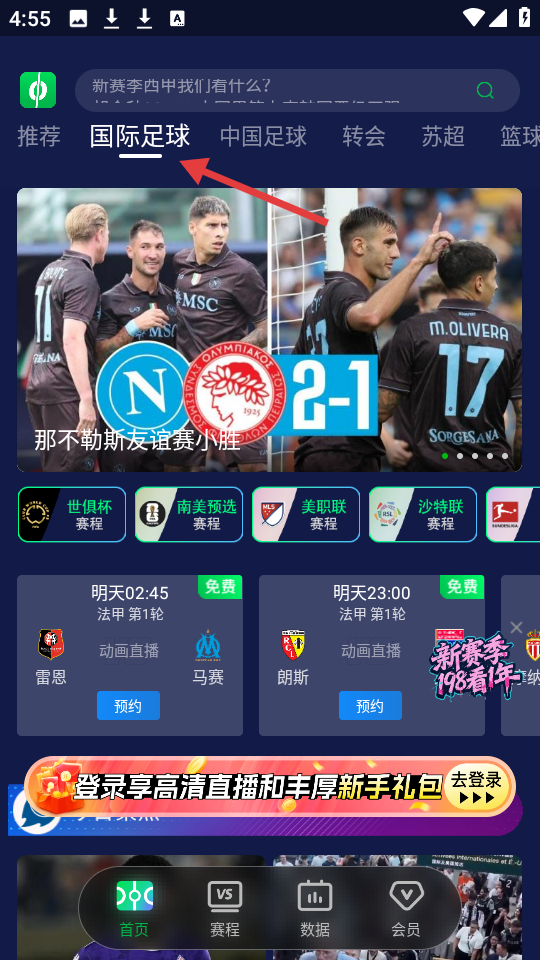2、該APP國際足球頁面,呈現(xiàn)賽事戰(zhàn)況,像那不勒斯友誼賽結(jié)果,還羅列世俱杯等賽程,可預(yù)約免費(fèi)比賽。