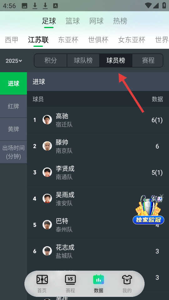 3、體育APP足球,江蘇聯(lián)球員榜頁面,顯示2025年球員進(jìn)球數(shù)據(jù),高馳等球員在列,下方有紅黃牌等其他數(shù)據(jù)選項(xiàng)。