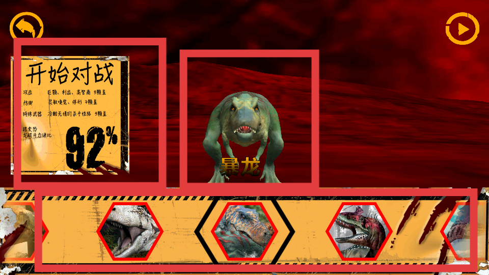 4、進(jìn)入對(duì)戰(zhàn)等環(huán)節(jié),可選擇不同恐龍,查看恐龍的攻擊、防御等屬性,準(zhǔn)備開始恐龍對(duì)戰(zhàn),體驗(yàn)刺激的對(duì)決。