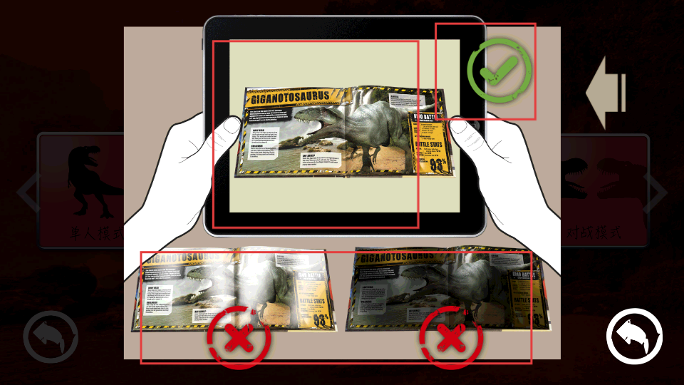 2、選擇單人模式后,根據(jù)提示操作,將設(shè)備對(duì)準(zhǔn)相關(guān)畫冊(cè),識(shí)別畫冊(cè)內(nèi)容,觸發(fā)AR恐龍展示。