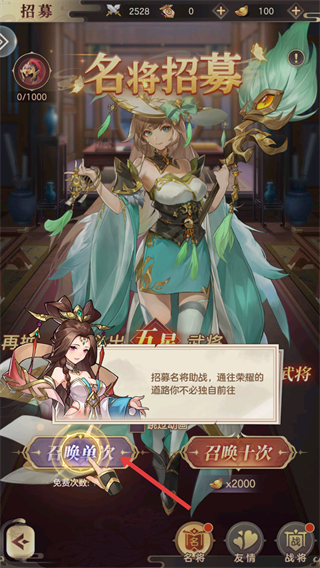 1、可進(jìn)行名將招募,選擇召喚一次或召喚十次,招募名將助戰(zhàn),增強(qiáng)戰(zhàn)力,推進(jìn)征戰(zhàn)進(jìn)程。