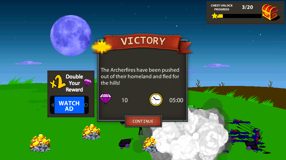 3、成功擊敗敵方,將敵人趕出領(lǐng)地后,會出現(xiàn)VICTORY的勝利界面,可獲得鉆石等獎勵,然后點擊CONTINUE繼續(xù)游戲進程。