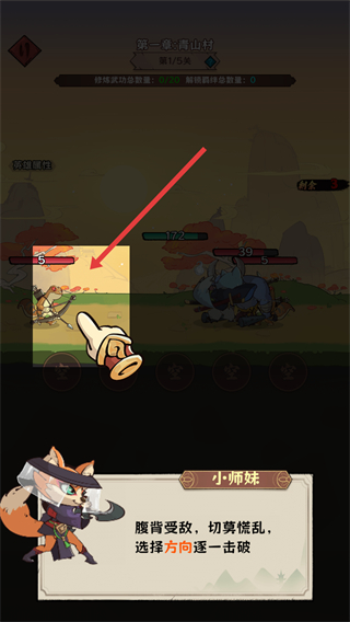 2、戰(zhàn)斗時需選擇方向擊破敵人,根據(jù)提示點擊對應(yīng)方向,逐一擊敗敵人,注意腹背受敵時切勿慌亂。
