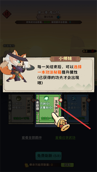 4、每一關(guān)結(jié)束后,可選擇一本功法秘籍提升屬性,已獲得的功法會出現(xiàn),選擇后可增強自身實力。