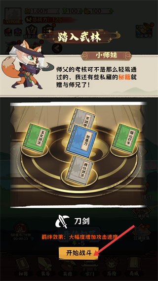 1、可選擇刀劍等武功秘籍,點擊開始戰(zhàn)斗,開啟武林冒險之旅,準備迎接師父的考核。