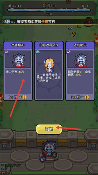 2、可選擇不同的增益效果,如傷害增加、招募冰霜女神、新增箭矢等,也可點擊刷新更換選項,提升防御能力。