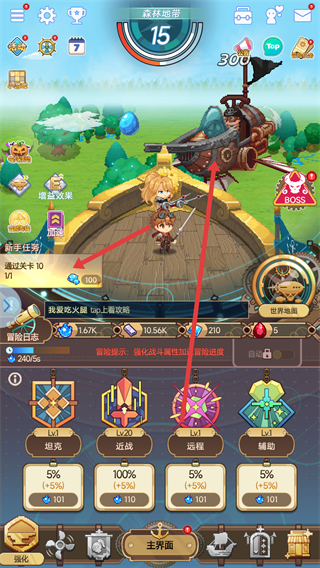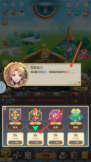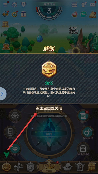 2、冒險過程會解鎖強化功能,可使用自動獲得的魔力增強各職業(yè)屬性,點擊空白處關(guān)閉解鎖提示,繼續(xù)游戲。