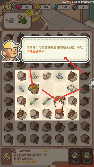 3、與被蜘蛛網(wǎng)蓋住的物品合成,可消除蜘蛛網(wǎng),獲得物品,豐富倉(cāng)庫(kù)內(nèi)的物品種類(lèi)。