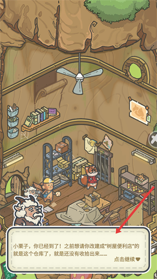 1、觸發(fā)劇情對(duì)話(huà),了解倉(cāng)庫(kù)改造為樹(shù)屋便利店的背景,點(diǎn)擊繼續(xù)推進(jìn)游戲進(jìn)程。