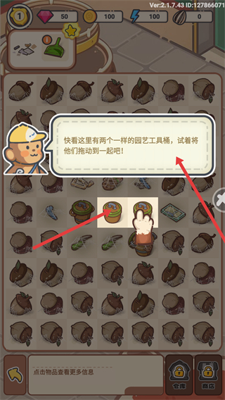 2、將兩個(gè)一樣的園藝工具拖動(dòng)到一起合成,合成后獲得新物品,提升物品等級(jí)和功能。