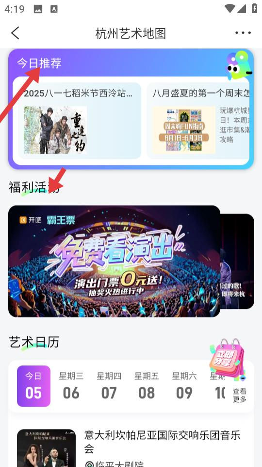 3、杭州藝術(shù)地圖頁今日推薦展示藝術(shù)活動(dòng),福利活動(dòng)推免費(fèi)演出抽獎(jiǎng),藝術(shù)日歷列近期活動(dòng),清晰呈現(xiàn)本地藝術(shù)動(dòng)態(tài),方便用戶參與。
