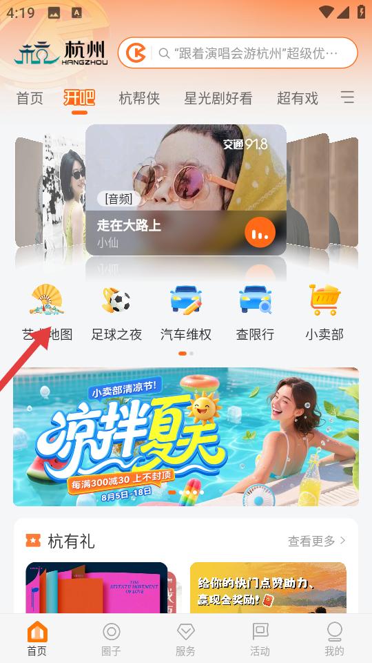 2、杭州頁面頂部有搜索開吧等板塊展示音頻內(nèi)容藝術(shù)地圖等功能入口排列,下方有清涼節(jié)活動(dòng)海報(bào),呈現(xiàn)本地特色服務(wù)與活動(dòng)。