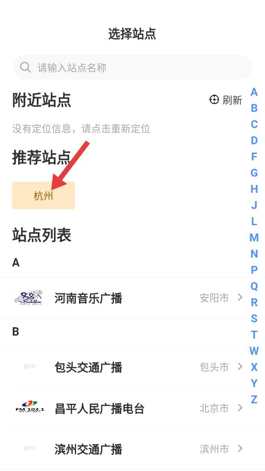 1、站點(diǎn)選擇頁設(shè)搜索欄分附近、推薦、列表,推薦站點(diǎn)含杭州,站點(diǎn)列表按字母排列廣播電臺(tái),方便用戶選想聽的廣播站點(diǎn)。