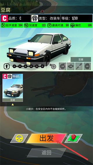 4、比賽結(jié)束后獲取基礎(chǔ)獎(jiǎng)勵(lì)、獲勝獎(jiǎng)金和拾取物等,利用獎(jiǎng)勵(lì)提升車輛等級(jí)和性能,繼續(xù)參與比賽,提升游戲?qū)嵙Α?