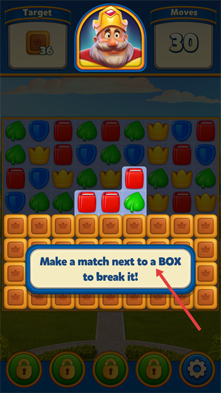1、游戲里要在盒子旁邊匹配相同元素,這樣能打破盒子,按照提示進(jìn)行匹配操作,推進(jìn)游戲。