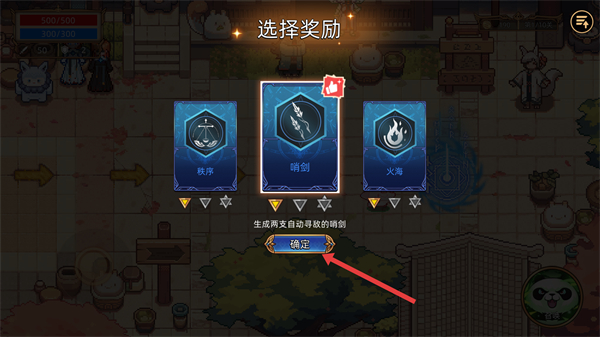 2、完成任務(wù)后會(huì)出現(xiàn)選擇獎(jiǎng)勵(lì)界面,可從秩序、哨劍、火焰等獎(jiǎng)勵(lì)中選擇,點(diǎn)擊確定獲取獎(jiǎng)勵(lì),提升角色能力。
