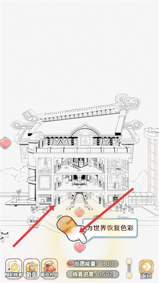 1、點(diǎn)擊色彩按鈕,為黑白的世界恢復(fù)色彩,逐步讓建筑和場景變得鮮艷,開啟色彩復(fù)蘇的旅程。