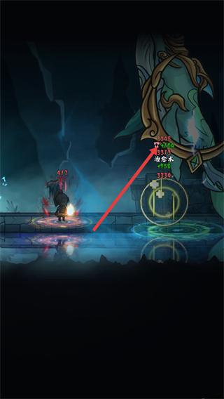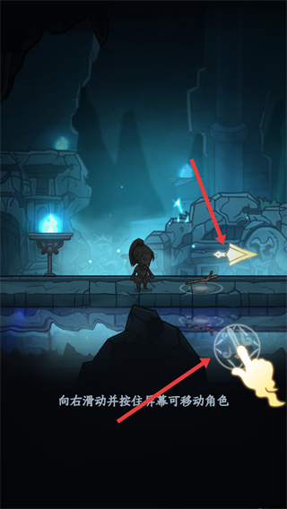 2、進入冒險場景后,可向右滑動并按住屏幕移動角色,跟隨箭頭提示探索場景,開啟冒險戰(zhàn)斗之旅。