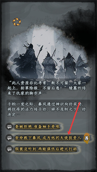 1、游戲開局會出現(xiàn)劇情選擇界面,可選擇舍命救下秦風(fēng)等選項,不同選擇將開啟不同游戲劇情線。