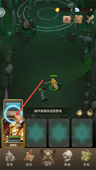 3、戰(zhàn)斗結(jié)束后可操作英雄傳送回營(yíng)地,點(diǎn)擊回城按鈕,讓英雄返回營(yíng)地,為后續(xù)行動(dòng)做準(zhǔn)備。