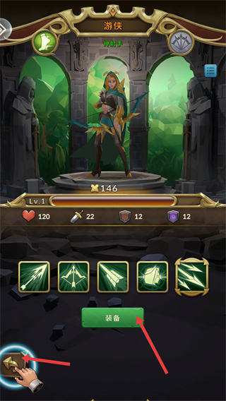 4、可獲取新英雄如游俠,查看英雄的等級(jí)、屬性和技能,點(diǎn)擊裝備按鈕為英雄裝備技能,提升戰(zhàn)力。