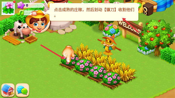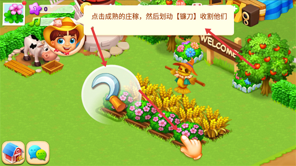 1、可點(diǎn)擊成熟的莊稼,然后劃動(dòng)鐮刀收割,獲取農(nóng)作物,為農(nóng)場(chǎng)經(jīng)營(yíng)積累資源。