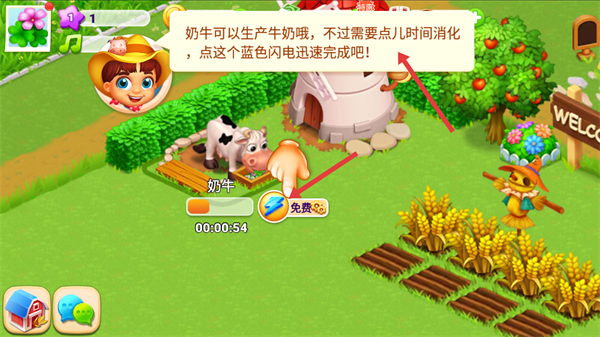 3、喂養(yǎng)奶牛后,奶牛可生產(chǎn)牛奶,生產(chǎn)過(guò)程需要時(shí)間,也可點(diǎn)擊藍(lán)色閃電快速完成生產(chǎn)。