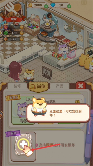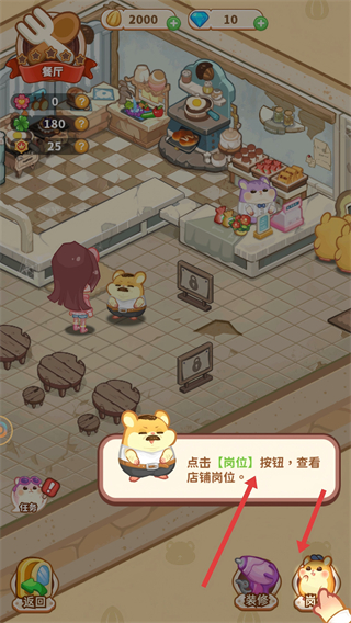 1、進入餐廳界面,可點擊崗位按鈕查看店鋪崗位,通過崗位設置來管理餐廳人員,助力餐廳經營。