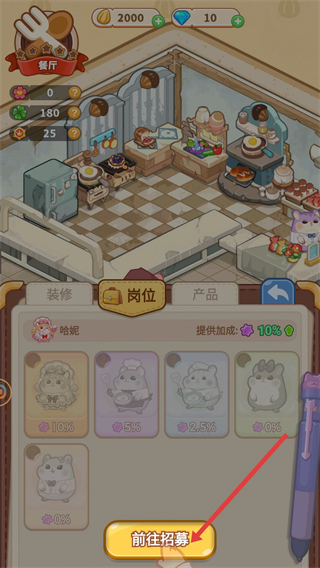 3、若崗位人員不足,可點擊前往招募按鈕,招募新的倉鼠員工,不同員工提供的加成不同。