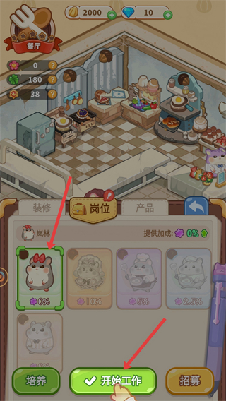 4、招募到員工后,可點擊開始工作按鈕安排其上崗,也可進行培養(yǎng)提升員工能力,提升餐廳經營效率。
