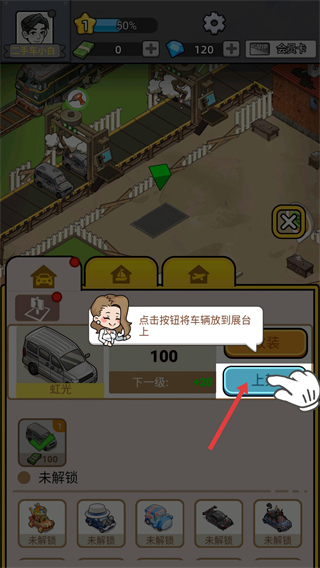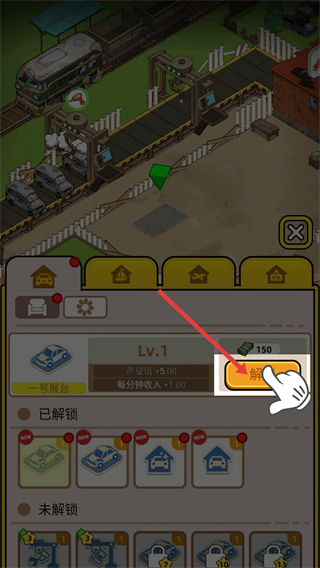 3、還可解鎖展臺(tái)等設(shè)施,如一號(hào)展臺(tái),解鎖后能用于車輛展示,助力工廠經(jīng)營(yíng)收益。