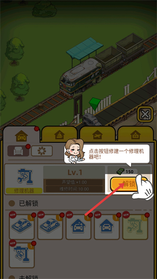 2、在修建界面,可花費(fèi)金幣解鎖修理機(jī)器,如Lv1修理機(jī)器,解鎖后可用于汽車修理作業(yè)。