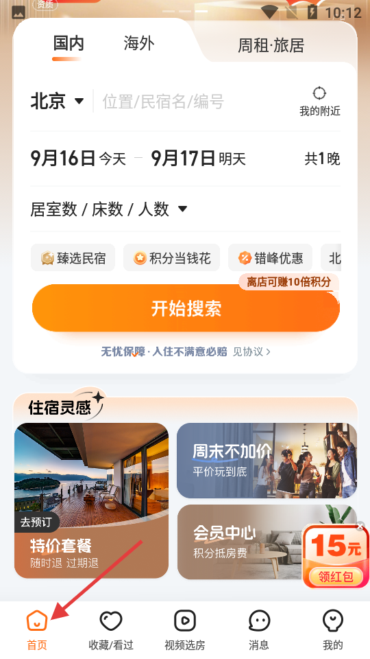 2、首頁(yè)提供國(guó)內(nèi)、海外民宿預(yù)訂,可按需輸入位置、日期等搜索,設(shè)住宿靈感區(qū),推特價(jià)套餐,有積分抵房費(fèi)等優(yōu)惠。