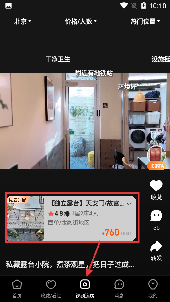 3、民宿詳情頁(yè)展示北京房源,如獨(dú)立露臺(tái)民宿,呈現(xiàn)評(píng)分、價(jià)格、位置等信息,方便用戶了解與選擇可互動(dòng)操作。