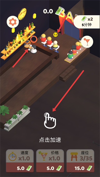 1、進(jìn)入酒吧經(jīng)營(yíng)場(chǎng)景,能看到吧臺(tái)、酒架和顧客,可點(diǎn)擊加速,讓酒吧運(yùn)營(yíng)節(jié)奏變快,提升效率。