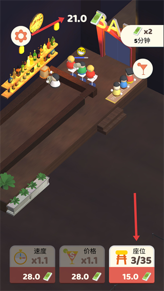 2、隨著經(jīng)營(yíng),會(huì)獲得收益,可用于升級(jí)座位等,增加酒吧可容納的顧客數(shù)量,讓酒吧更熱鬧。