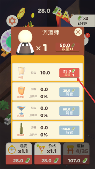 3、還能解鎖和升級(jí)酒水,比如啤酒可升級(jí)等級(jí),也能解鎖威士忌、雞尾酒等更多種類,滿足顧客需求。