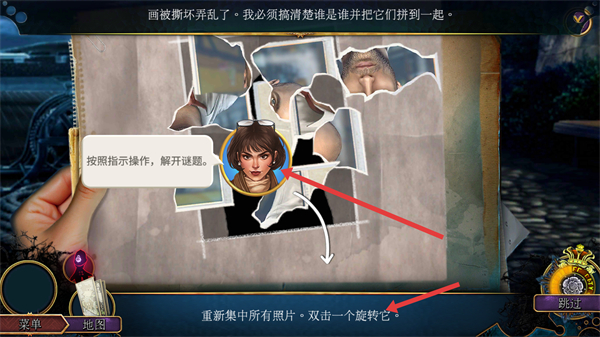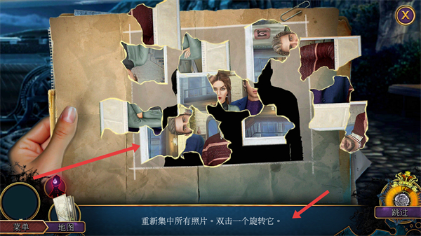 1、需要拼接被撕壞的照片,雙擊照片可旋轉(zhuǎn)它,重新集中所有照片,解開謎題,推進(jìn)劇情。