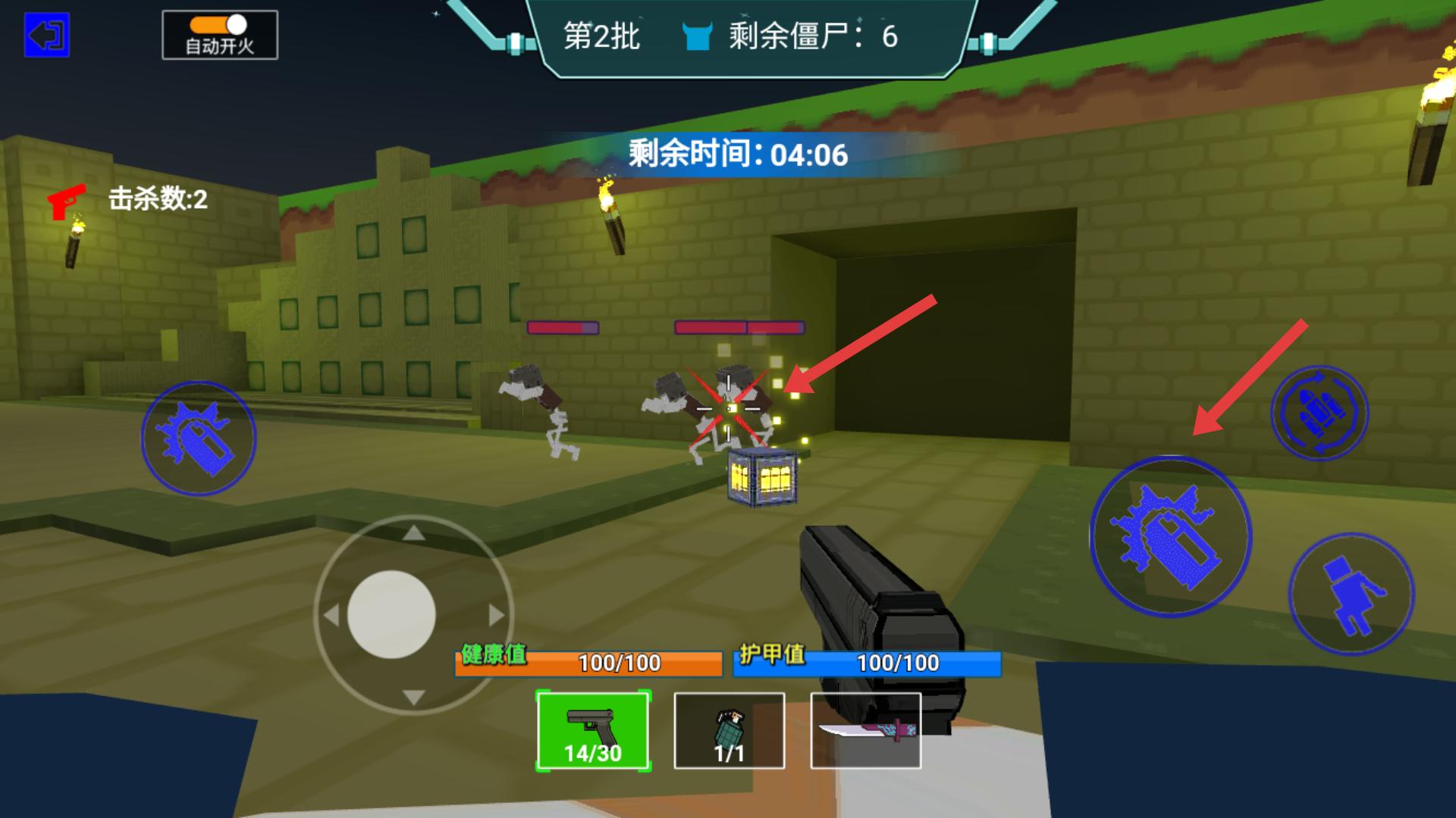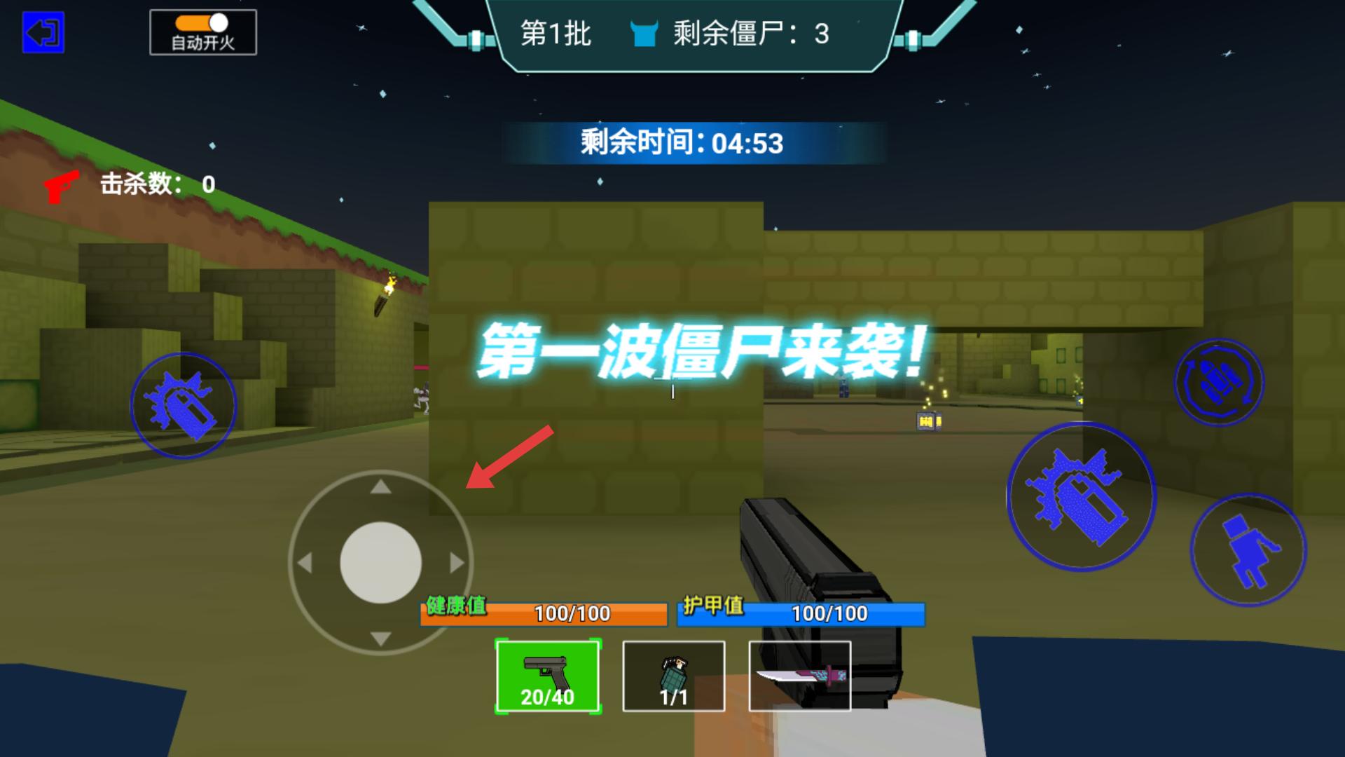 2、第一波僵尸來(lái)襲時(shí),利用左側(cè)操控盤(pán)移動(dòng)角色,瞄準(zhǔn)僵尸射擊,注意剩余時(shí)間與僵尸數(shù)量,盡量多擊殺。