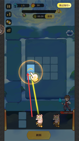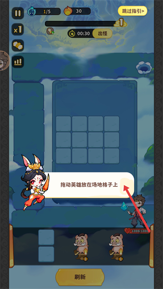 2、戰(zhàn)斗時(shí)需拖動英雄放在場地格子上,按照提示操作,布置英雄到合適位置,構(gòu)建防御陣容。