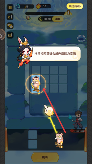 4、可拖動相同英雄合成,合成后英雄能力變強(qiáng),提升防御戰(zhàn)力,更好地抵御敵人,推進(jìn)游戲進(jìn)程。