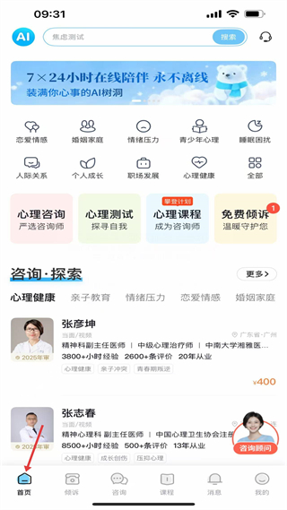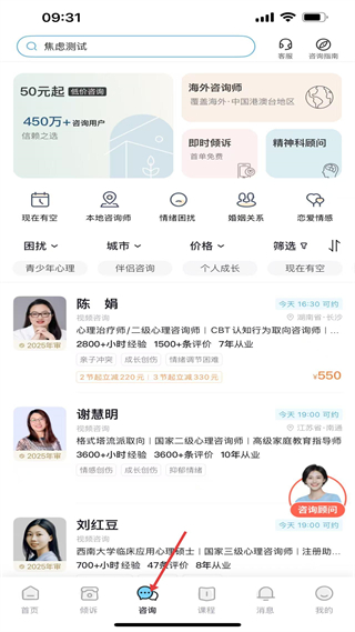 3、咨詢板塊,有低價咨詢等服務(wù),可篩選咨詢師,展示其經(jīng)驗、擅長領(lǐng)域及預(yù)約信息,方便選心理咨詢服務(wù)。