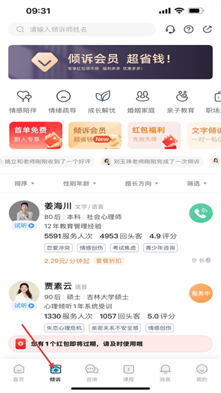 2、傾訴板塊,提供情感陪伴等傾訴服務(wù),有首單免費等福利,展示傾訴師信息,可選擇傾訴師心理傾訴。