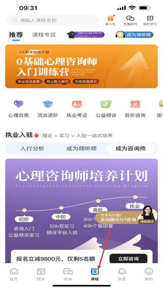 4、課程板塊,提供心理自愈、流派進階等心理課程,還有心理咨詢師培養(yǎng)計劃,助力用戶學(xué)習(xí)心理知識或成為心理咨詢師。