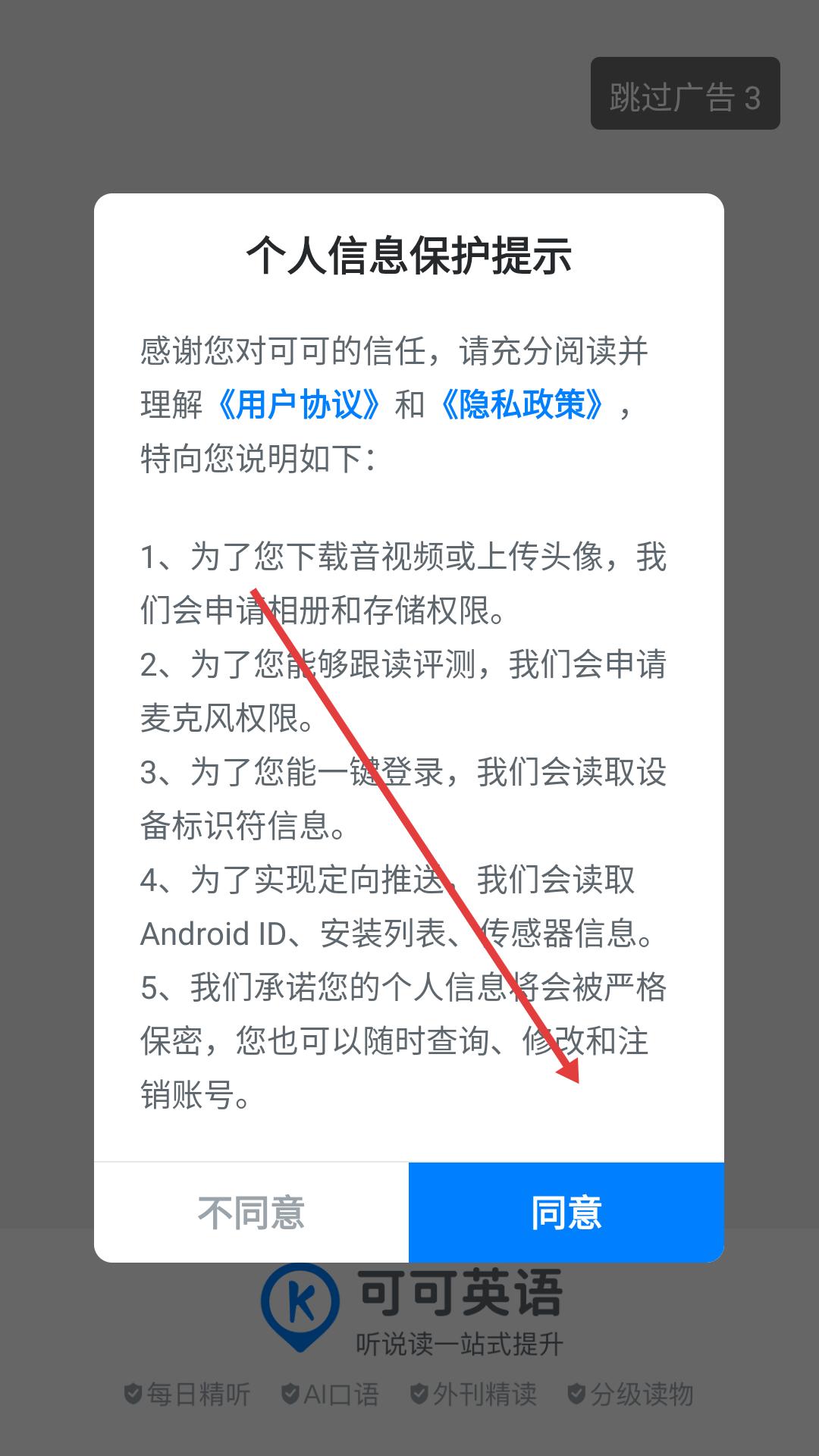 1、下載安裝完成后進(jìn)入,需在用戶協(xié)議和隱私政策界面點(diǎn)擊同意,接受相關(guān)條款后才能進(jìn)入應(yīng)用。