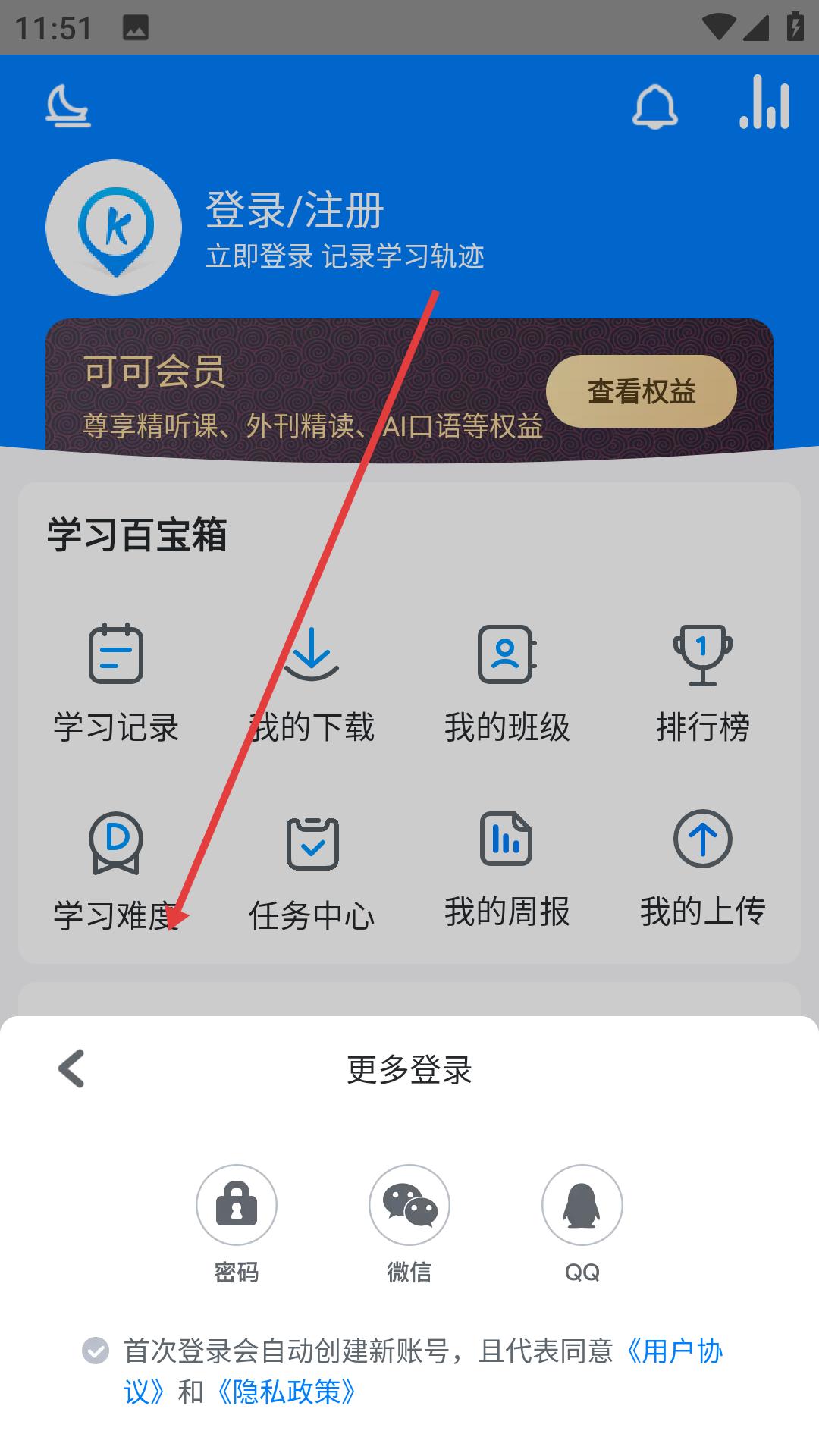 3、可可英語支持多種登錄方式,點(diǎn)擊更多登錄,可選擇密碼、微信、QQ等方式登錄,首次登錄會(huì)自動(dòng)創(chuàng)建新賬號(hào)。