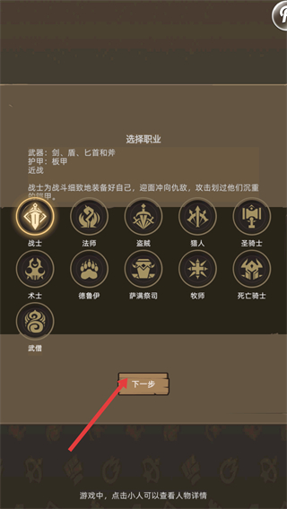 1、可選擇職業(yè),如戰(zhàn)士、法師等,不同職業(yè)有不同武器、護(hù)甲和近戰(zhàn)特點,選擇后點擊下一步繼續(xù)。