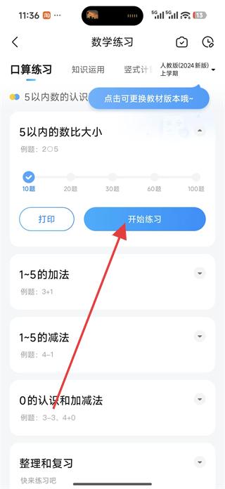 2、在數(shù)學(xué)練習(xí)口算練習(xí)頁面,選擇5以內(nèi)數(shù)的認(rèn)識中的5以內(nèi)的數(shù)比大小,點(diǎn)擊開始練習(xí),進(jìn)入練習(xí)題目頁面。