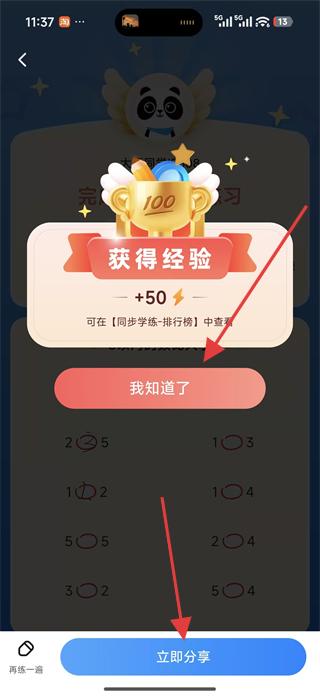 4、完成練習(xí)后在獲得經(jīng)驗(yàn)的提示頁面,點(diǎn)擊我知道了,然后點(diǎn)擊立即分享,可將練習(xí)成果分享出去。