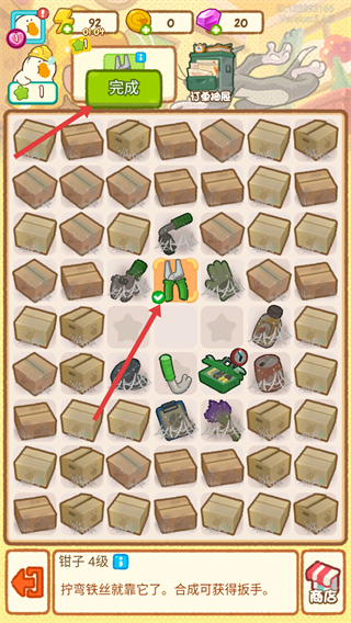 1、合成鉗子等工具后,點(diǎn)擊完成按鈕可完成對(duì)應(yīng)操作,推進(jìn)健身房建設(shè),積累游戲資源。